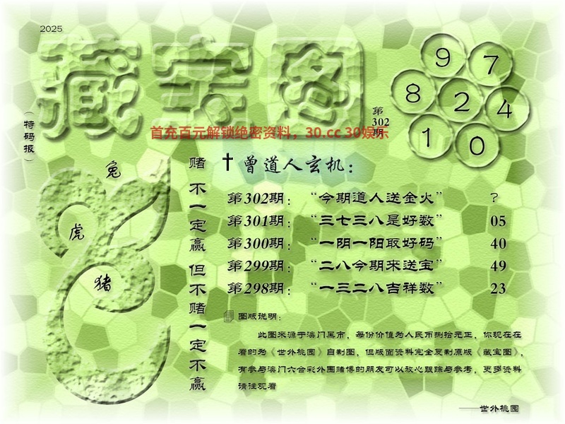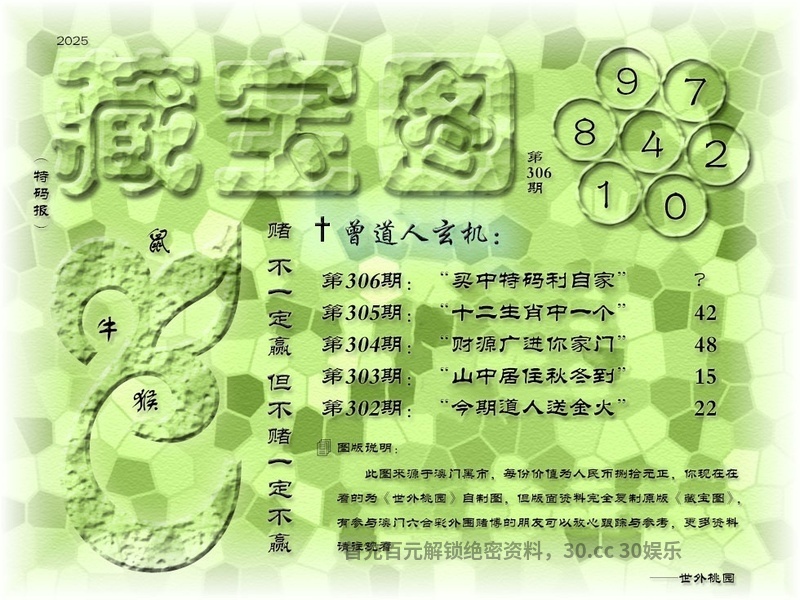 | 302期:今期道人送金火 解释:今期道人送金火,金肖猴鸡,火肖蛇马 藏宝九肖:猴鸡蛇马牛羊龙兔狗 藏宝⑩码:22.34.21.13.36.05.23.02.03.32 |