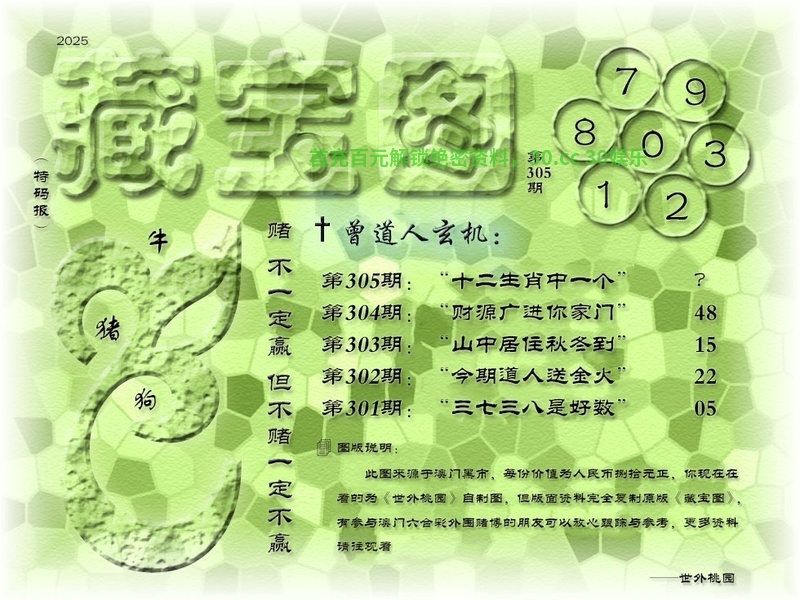 | 304期:财源广进你家门 解释:财源广进你家门,解家禽牛鸡猪羊马狗 藏宝九肖:牛鸡猪羊马狗兔猴龙 |
